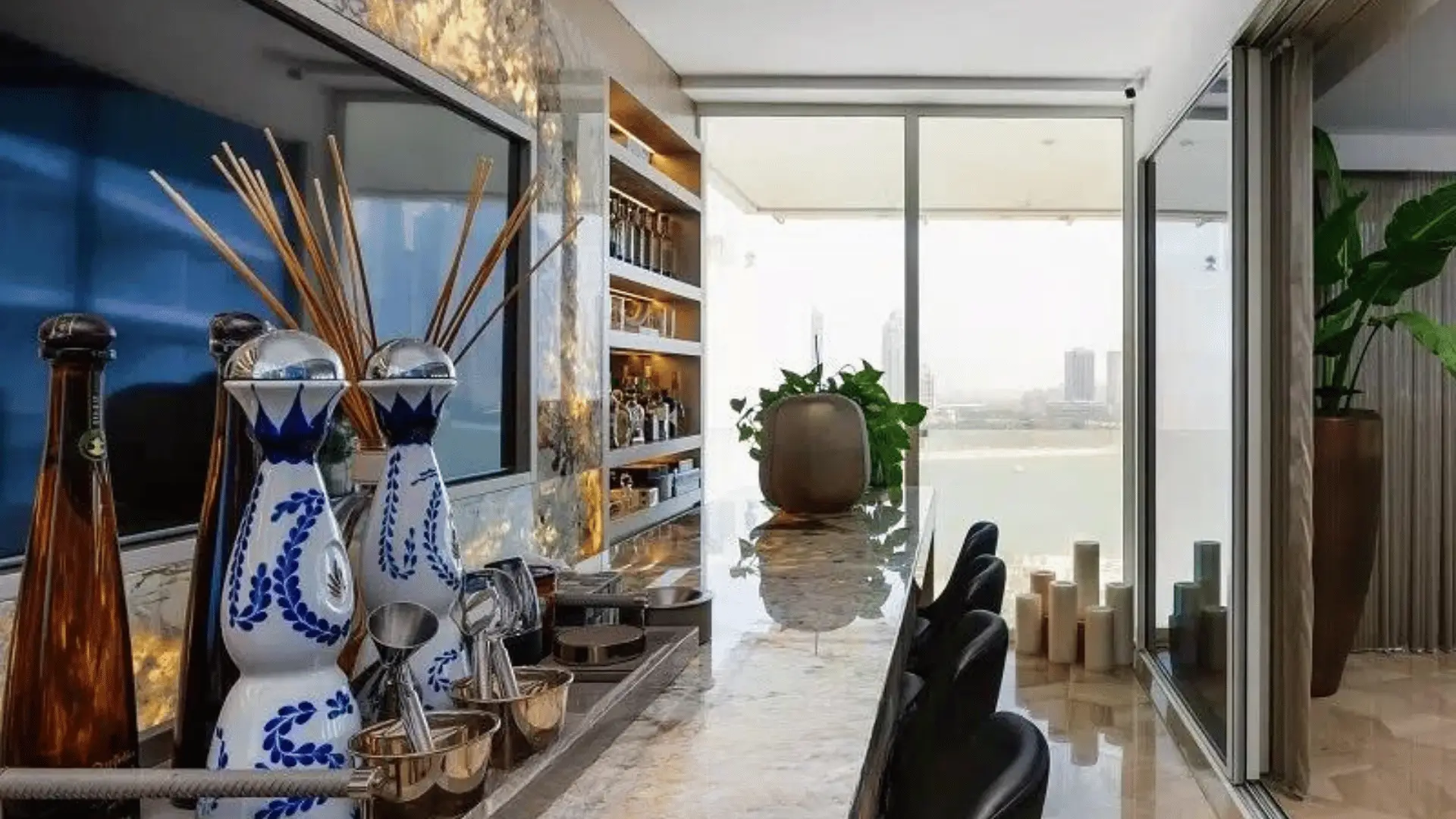 Experience breathtaking sunset and skyline views from the spacious family/cinema rooms, where each door opens to reveal stunning vistas. This penthouse includes four roomy bedrooms, each with its bathroom. The master bedroom is impressive, with a luxurious walk-in closet, jacuzzi, and a large private balcony with sun loungers and sofa seating.