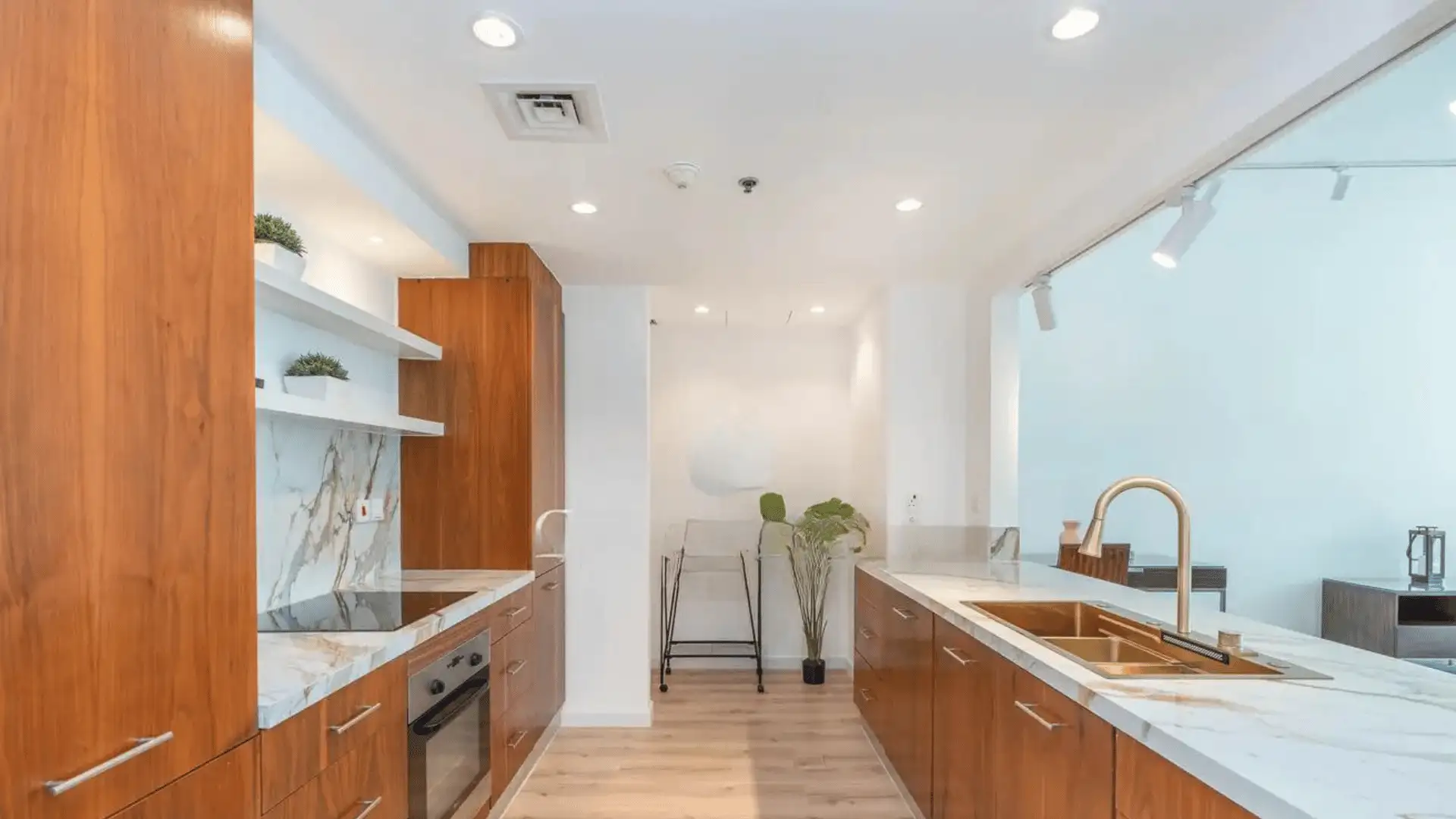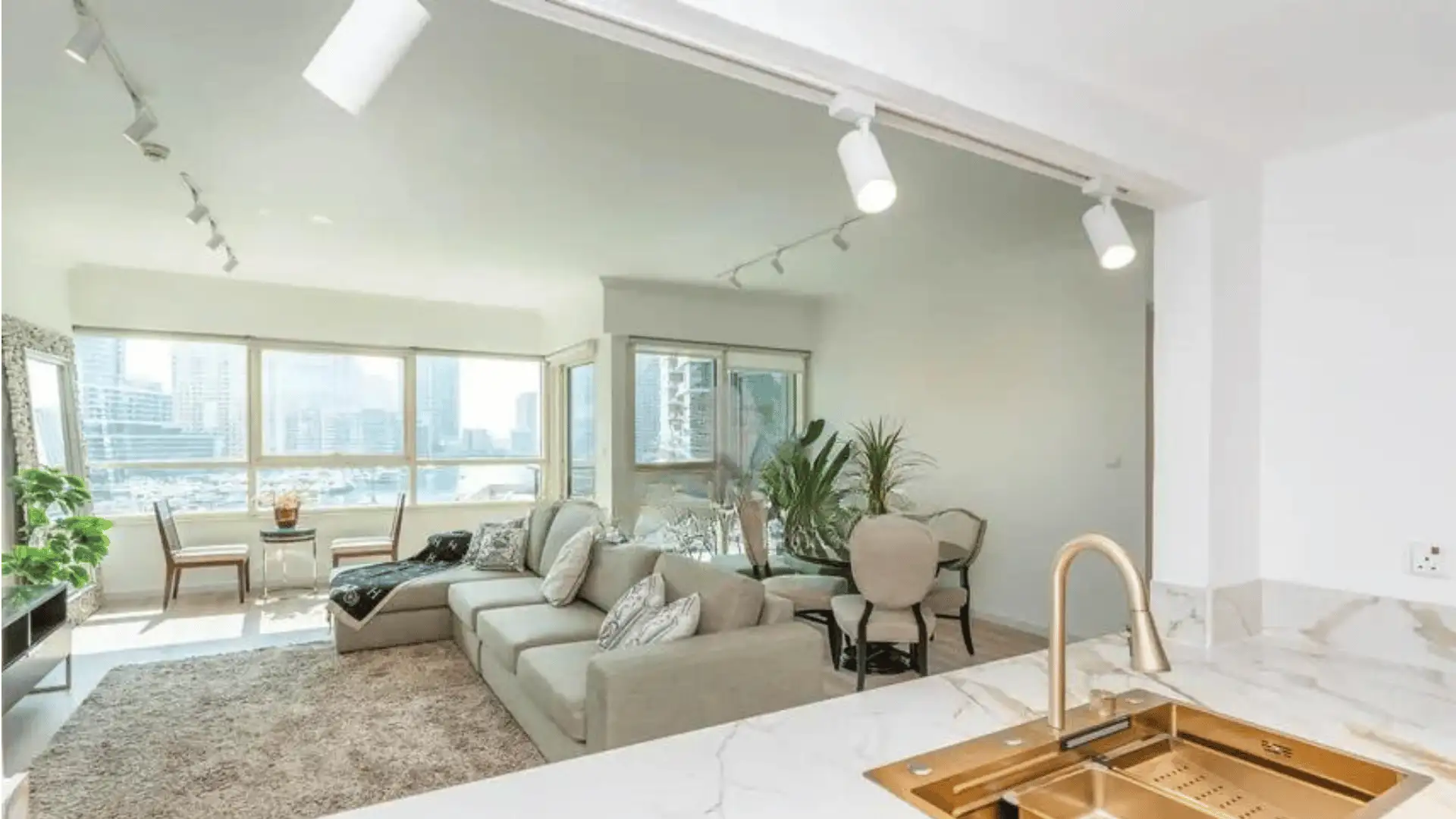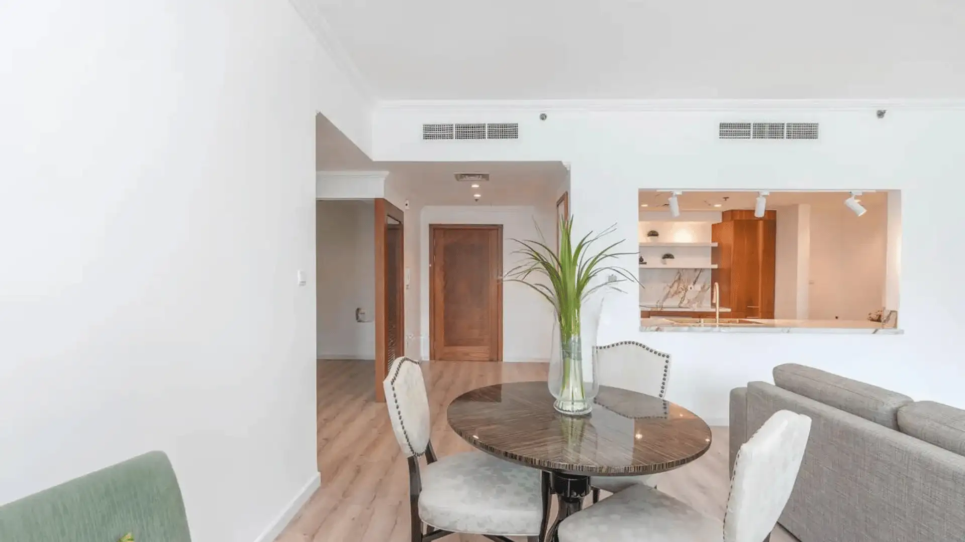 This apartment has a lot of great things about it. It’s not too high or too low in the building; it has lovely new floors, one bathroom, and a big living and dining area with natural light because of the tall windows. There’s also a big balcony with beautiful views of the Marina, Vida Hotel, and fancy yachts. Inside is a kitchen with everything you need, and the main bedroom has a door leading right to the balcony. The study room got a stylish upgrade with sliding doors, and it even comes with a parking spot in the basement. It’s a pretty tempting offer.