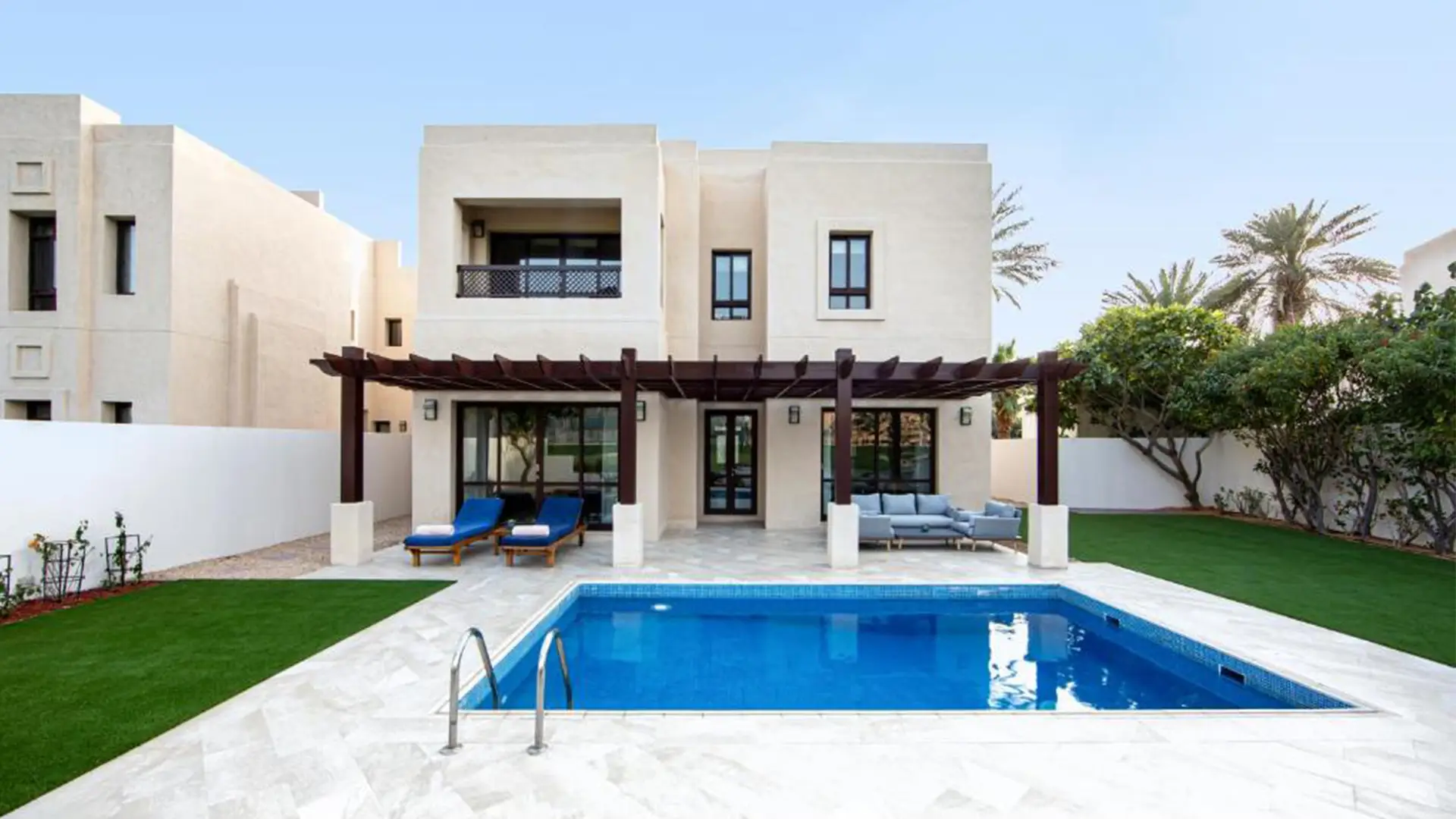It’s a spacious house with 5 bedrooms and even a room for a maid. There are 6 bathrooms in this house. The built-up area is 4,303 square feet and sits on a 5,543.41 square feet plot. This villa is a V3 type, and it has a fantastic view of the entire golf course. You even get your private pool with temperature control, which is fantastic. There’s also a sunken fire pit and seating area and a covered BBQ and seating area. The kitchen is upgraded, with built-in appliances and an upstairs family area for everyone to enjoy.