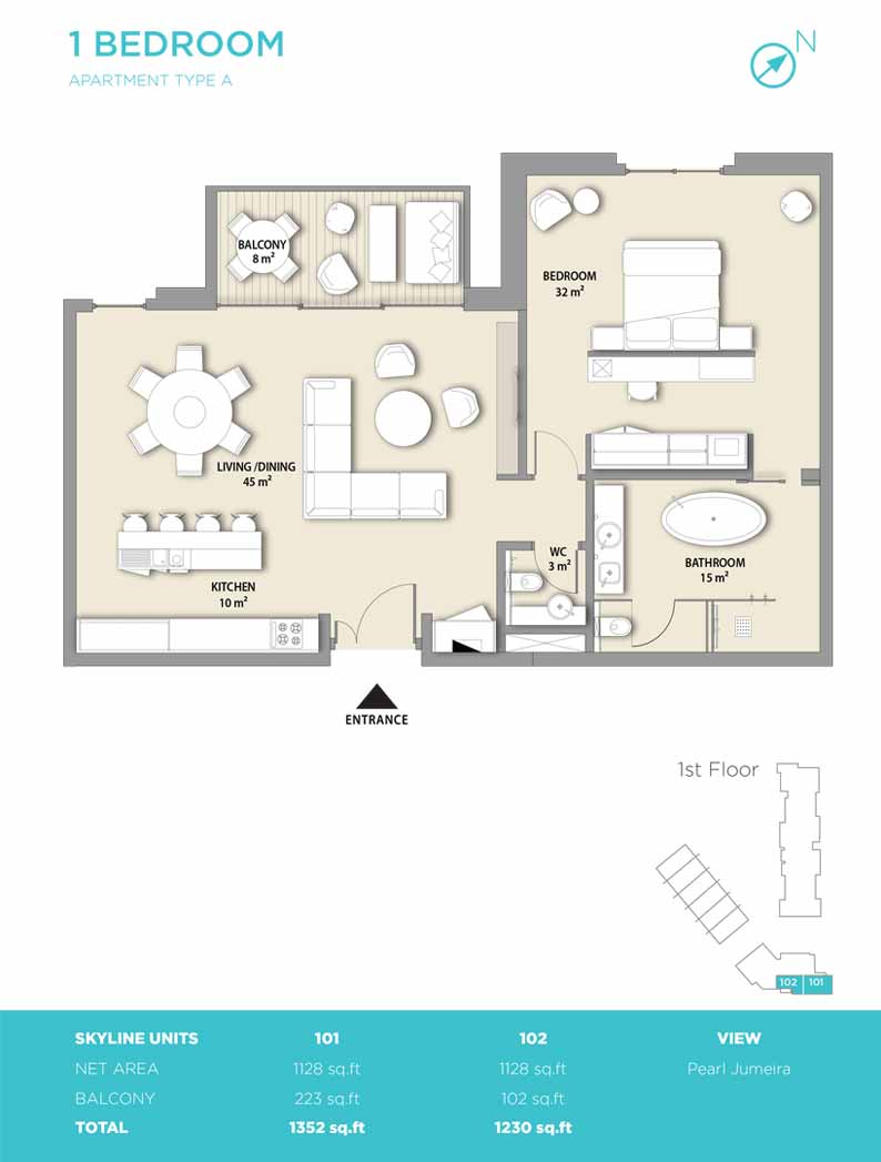 | 1 Bedroom | All | 1 bedroom type A 1352 | 1352.00 Sq Ft | Apartment | |