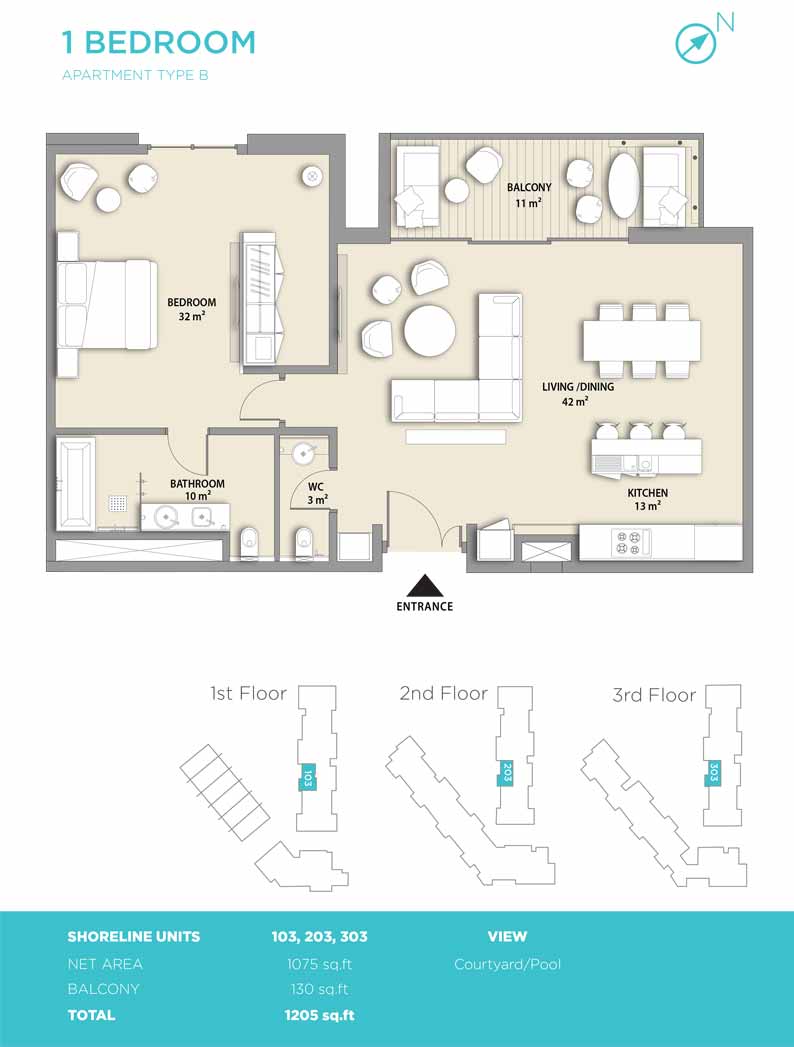 | 1 Bedroom | All | 1 bedroom type B 1205 | 1205.00 Sq Ft | Apartment | |