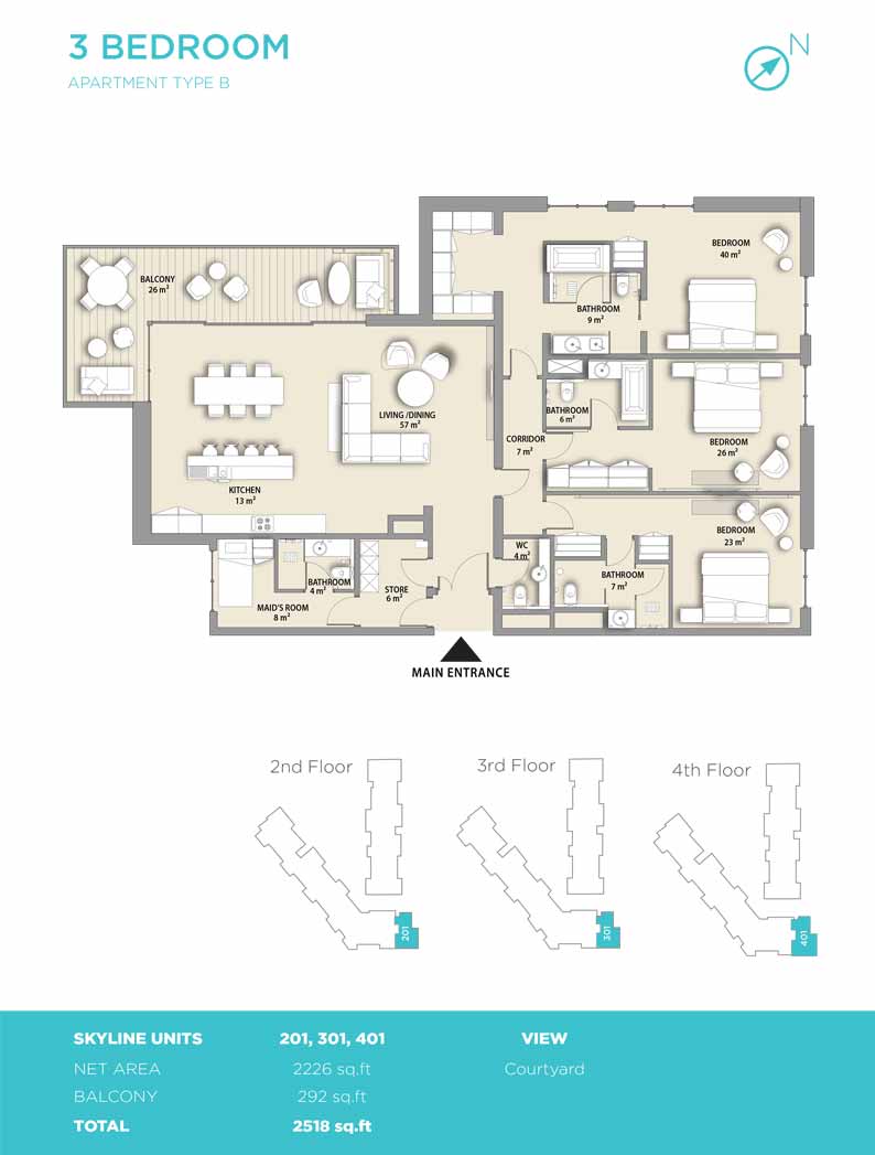 | 3 Bedrooms | All | 3 bedroom type B 2518 | 2518.00 Sq Ft | Apartment | |