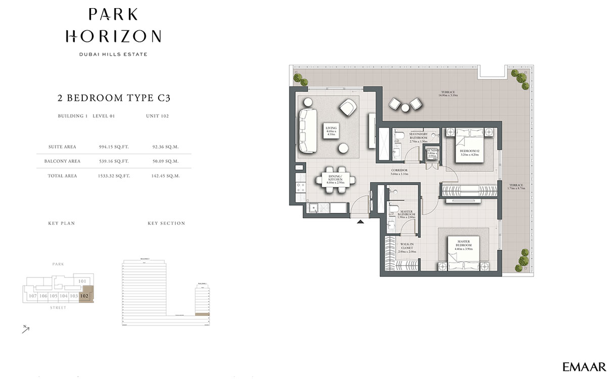 Building 1 2 Bedrooms Type C3, Level 01, Unit 102 1533.32 Sq Ft Apartment