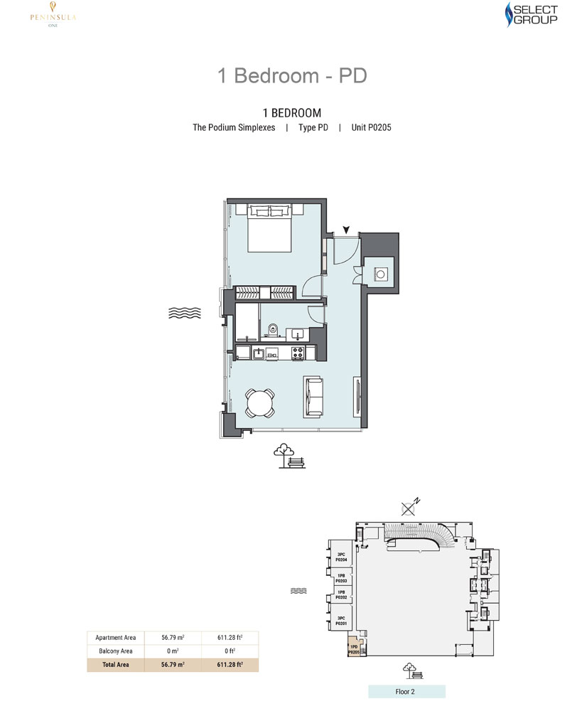 1 Bedroom All The Podium Simplexes, Type PD, Unit P0205 611.28 Sq Ft Apartment