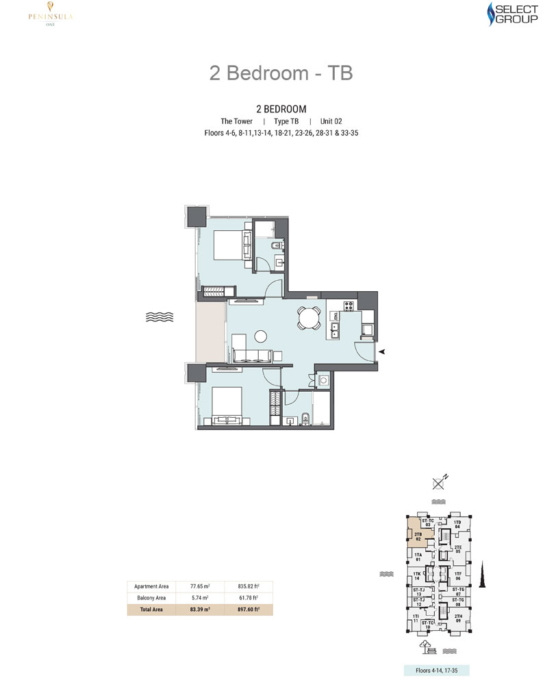 2 Bedroom All The Tower, Type TB, Unit 02, Floors 4-6,8-11,13-14,18-21,23-26,28-31, & 33-35 897.60 Sq Ft Apartment