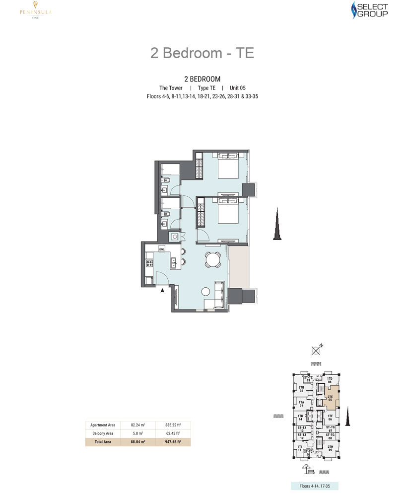 2 Bedroom All The Tower, Type TE, Unit 05, Floors 4-6,8-11,13-14,18-21,23-26,28-31, & 33-35 947.65 Sq Ft Apartment