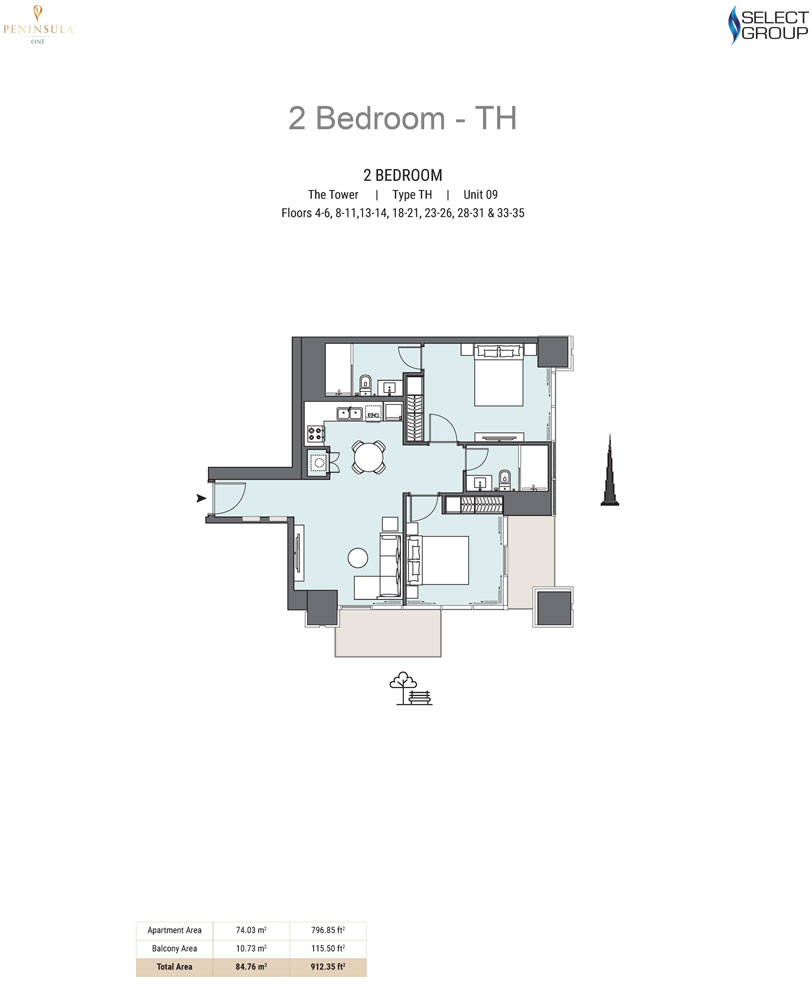 2 Bedroom All The Tower, Type TH, Unit 09, Floors 4-6,8-11,13-14,18-21,23-26,28-31, & 33-35 912.35 Sq Ft Apartment