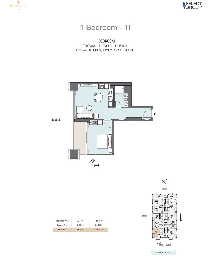 1 Bedroom All The Tower, Type TI, Unit 11, Floors 4-6,8-11,13-14,18-21,23-26,28-31, & 33-35 614.19 Sq Ft Apartment