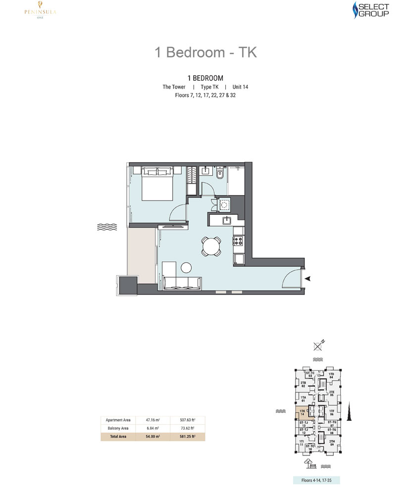 1 Bedroom All The Tower, Type TK, Unit 14, Floors 7,12,17,22,27 & 32 581.25 Sq Ft Apartment