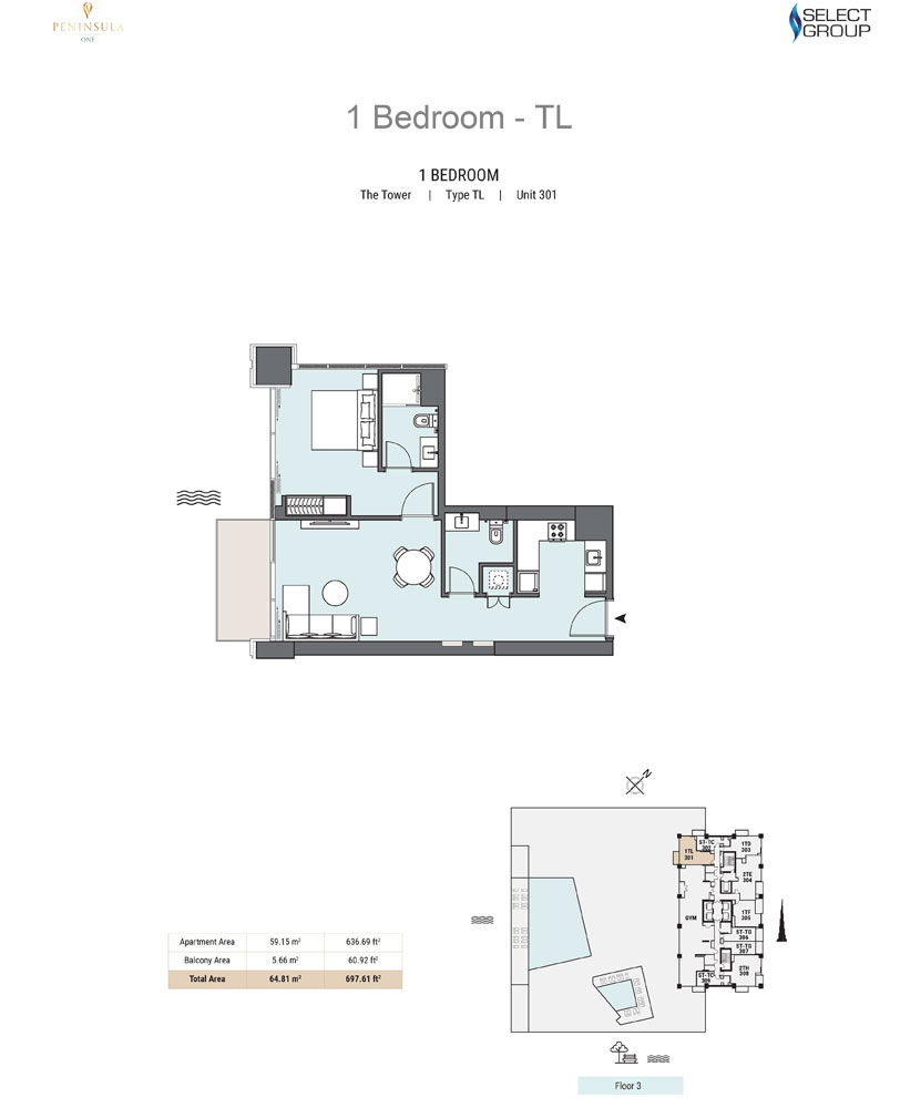 1 Bedroom All The Tower, Type TL, Unit 301 697.61 Sq Ft Apartment
