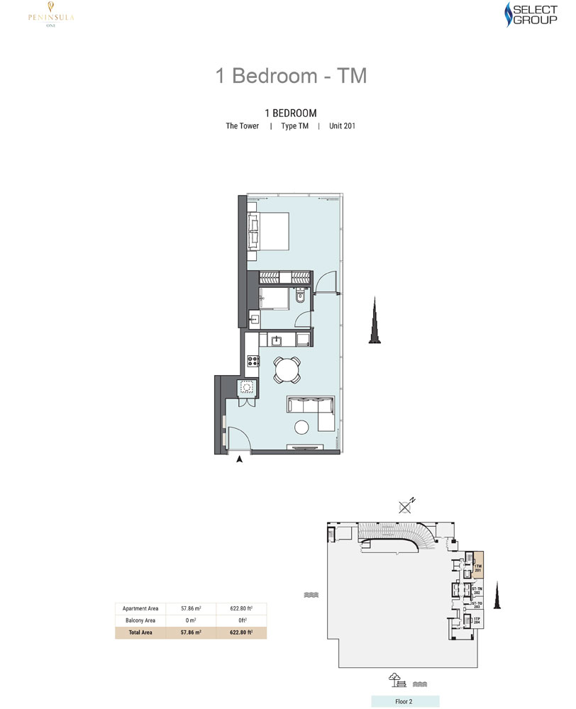 1 Bedroom All The Tower, Type TM, Unit 201 622.80 Sq Ft Apartment