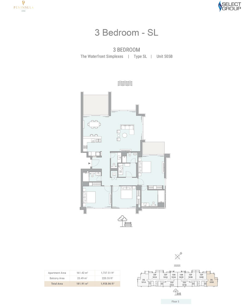 3 Bedroom All The Waterfront Simplexes, Type SL, Unit 505B 1958.06 Sq Ft Apartment