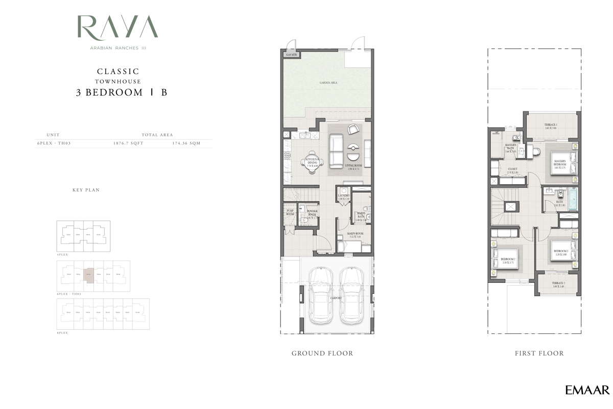 | 3 Bedroom | 3 Bedrooms + Maid | Classic Townhouse - B, Unit 6 Plex - TH03 | 1876.70 Sq Ft | Townhouse | |