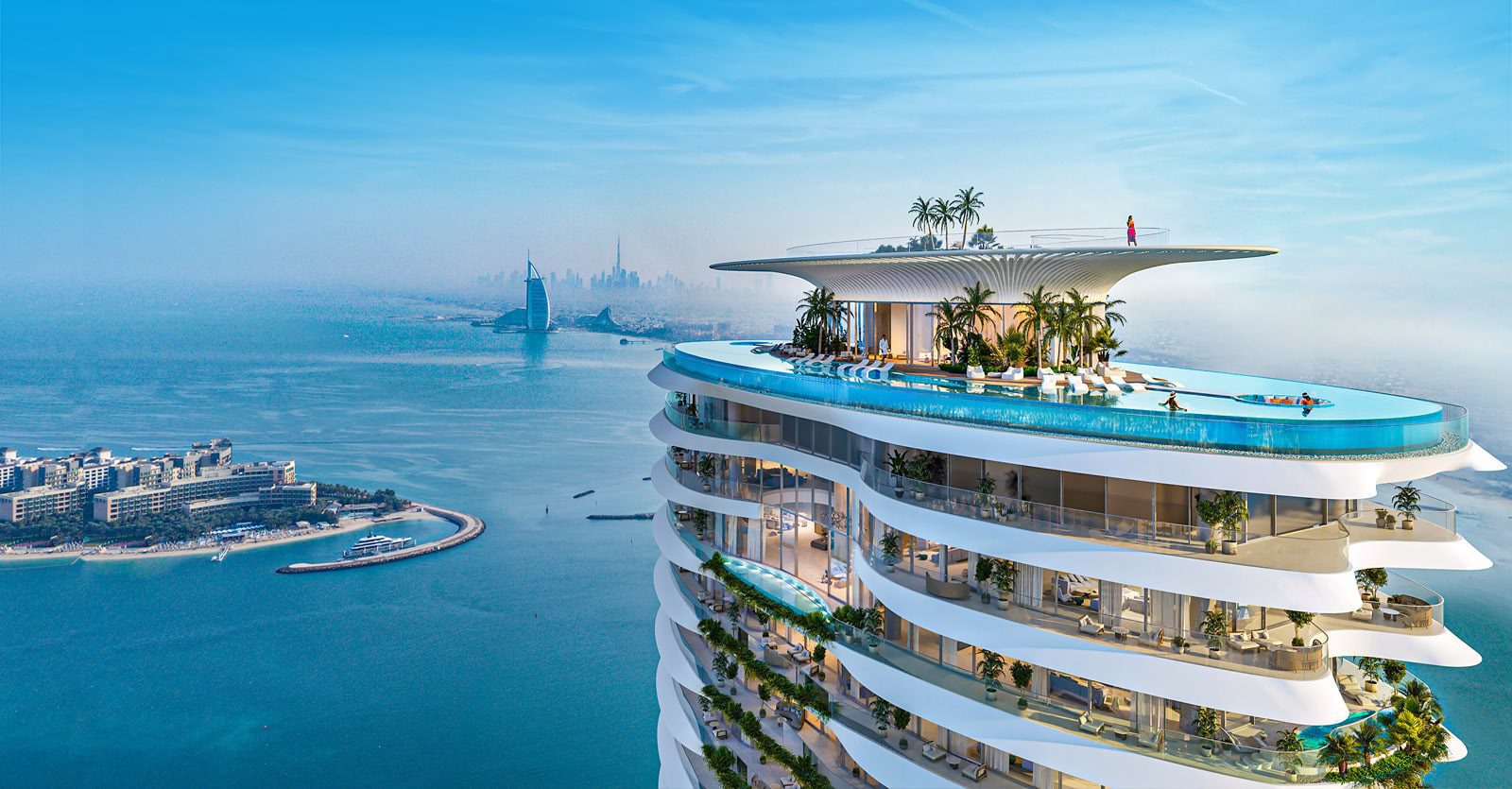 Como Residences, a luxurious waterfront development by Nakheel Properties, is located on Palm Jumeirah. This magnificent tower, shaped like a seashell, will soar above the skyline. Como Residences offers a limited collection of exceptional homes with only 76 exclusive residences available, including apartments with 2-6 bedrooms, duplexes with 7 bedrooms, and a breathtaking 5-bedroom penthouse. The tower will stand at 75 stories (G+3P+71), making it the tallest on the island at 984 ft.